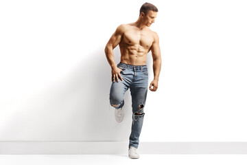 Shirtless male model wearing jeans and leaning on a wall