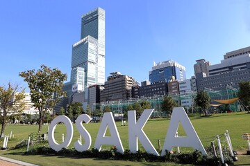 大阪を象徴するOSAKAの文字とあべのハルカス