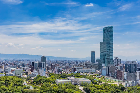Osaka skyline from observation deck of Osaka's Abeno Harukas, the tallest skyscraper in Japan. Large windows cityscape background.