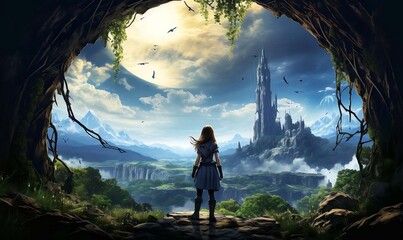 Abenteuer Mädchen mit Blick auf antike Stadt im Dschungel
