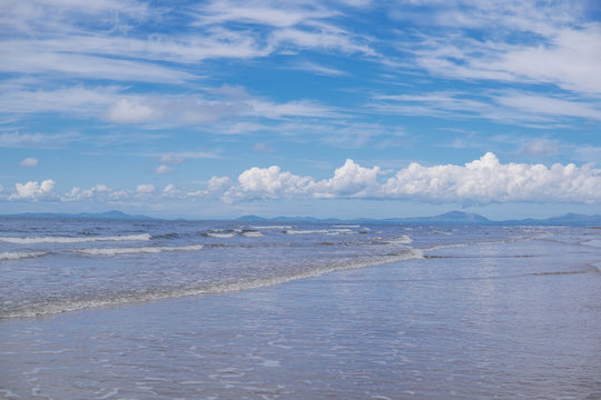 A misty shore due to sand on a windy day along the Traeth Abermaw Beach in Barmouth, Wales.