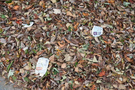 Rot - Gelb gefärbte Blätter eines Laubbaumes während der letzten sonnigen Tage des Jahres kurz bevor sie abfallen, Aufnahme von unten gegen den Himmel