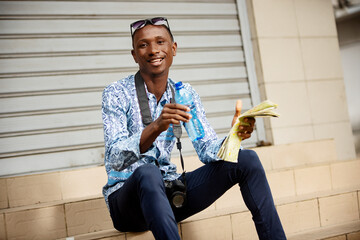 Portrait of a young tourist man looking for his landmarks with a map in town.