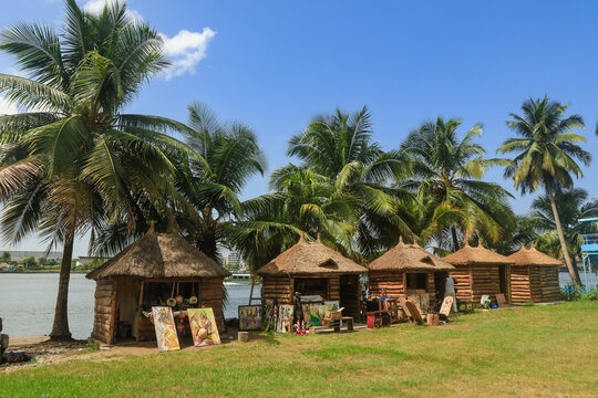 Artisans showcase their crafts near traditional huts along the river in Abidjan, Ivory Coast