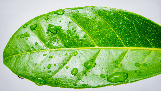 Fresh Green Leaf with Water Droplets Isolated on White Background Representing Biotic and Abiotik Interaction Concept