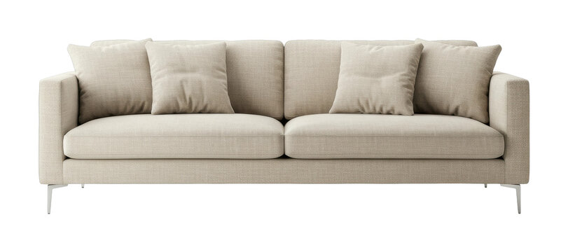 Elegant beige sofa with cushions on metal legs for modern living room. Cut out PNG