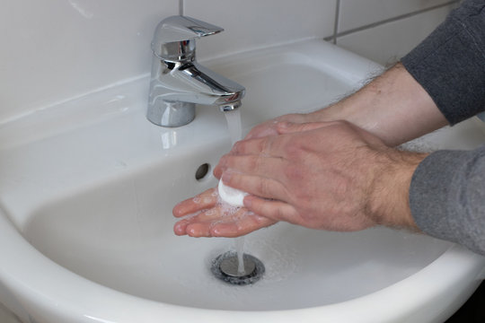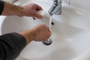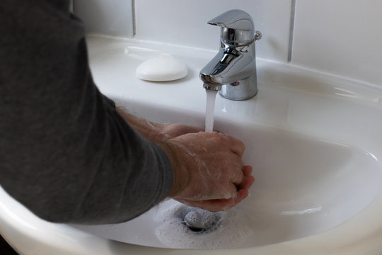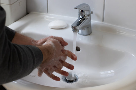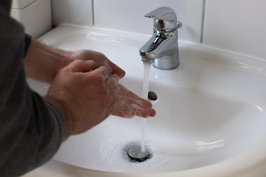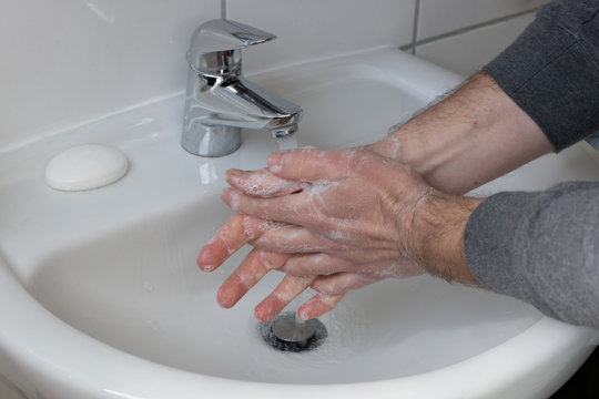 Detail of a Young male washing his Hands with Soap under running water in order to reduce infection Risk during corona Virus pandemic