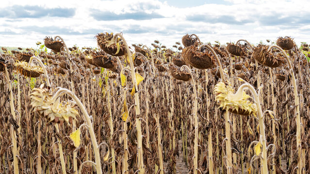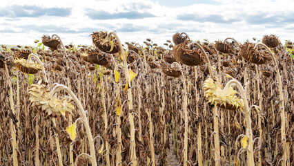 Dry autumn leaves hang on a bare branch under a clear sky, symbolizing drought, climate change and hot summer weather.