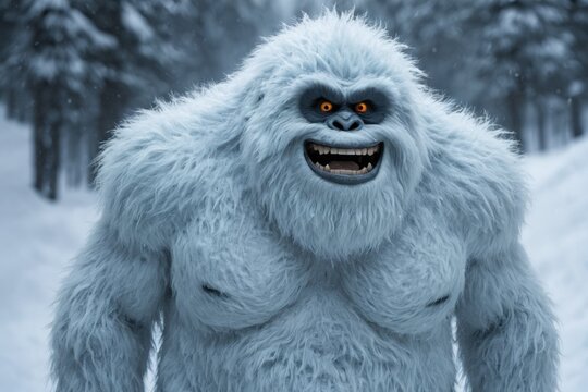A close-up shot of a large, furry Yeti standing in a snowy forest. The Yeti is smiling, showing its teeth, with bright orange eyes