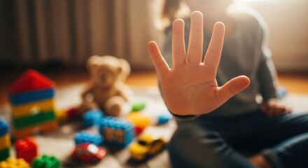 shot of a kid's palm facing outwards in a classic "stop" motion, expressing refusal