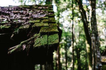 Green Moss on the roof of Abondon house in forest