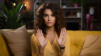 Young woman holds abortion pill, water glass. Sits sofa. Closeup view shows hand. Health care choice. Medication. Woman takes medicine. Female patient. Pregnancy decision. Unwanted pregnancy.