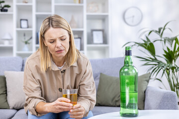 An alcoholic woman drinks strong alcohol, is depressed and sits alone at home on the sofa in the living room.