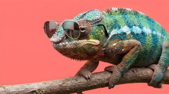 Cool Green and Blue Chameleon Wearing Sunglasses on Branch Against Pink Background