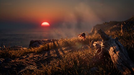 stunning sunset landscape with wildflower and dramatic lighting in nature's beauty - AI Generated Digital Art