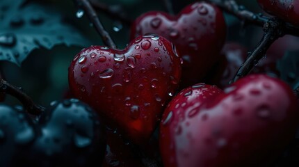 Heart shaped cherries with water drops