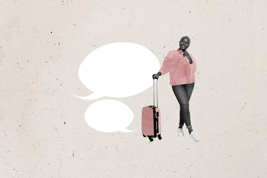 Banner 3d sketch image collage of happy girl hold suitcase stand bubble communication chatterbox summer relocation concept