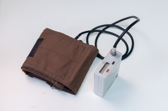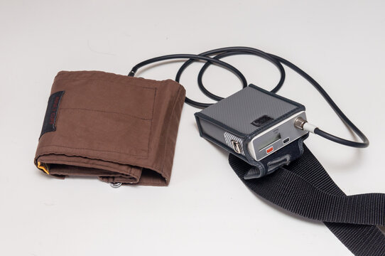 Body of a middle aged man using portable Ambulatory Blood Pressure Monitor (ABPM) for taking measurements during normal daily activities at home.
