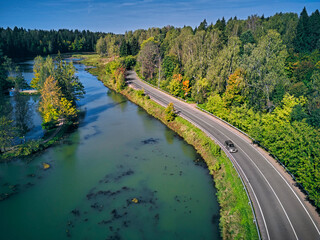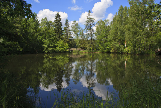 Beautiful landscape scenery of pond by road at Abramtsevo, Sergiyev Posad, Russia