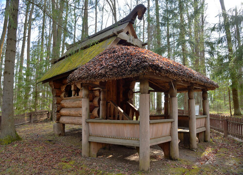 Wooden gazebo from log house called "Hut on Chicken Legs", built in 1883, Abramtsevo Museum, Abramtsevo, near town of Sergiev Posad, Moscow  region, Russia