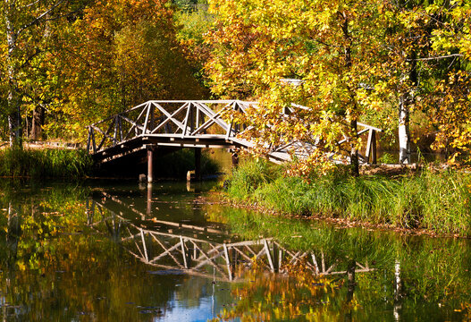 Autumn landscape with a wooden bridge over the Voria River, in Abramtsevo, Moscow Oblast, Russia