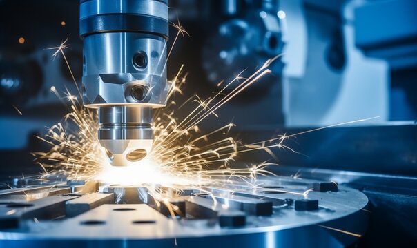A closeup of an aluminum spool turning on the lathe, with sparks flying around it in blue and white tones. The background is dark and blurred, creating depth.