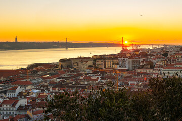 Sunset view of the Sanctuary of Christ the King monument and statue looking over the Tagus River and the Ponte 25 de Abril bridge from the Alfama district in Lisbon, Portugal.