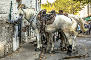 White saddled horses waiting crop