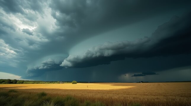 A dramatic landscape showcasing a sudden change in weather, with dark storm clouds rolling in over a sunny field, illustrating the contrast between light and shadow