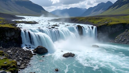 Emerging from the leading edge of a receding glacial mass, a torrent of meltwater finds an abrupt termination, plummeting over a precipice composed of compacted sediment and embedded stones
