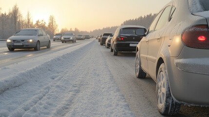 abrupt braking on icy road, ABS pulsing, car sliding slightly sideways, snow flying, cold winter environment, clean minimalistic style, soft