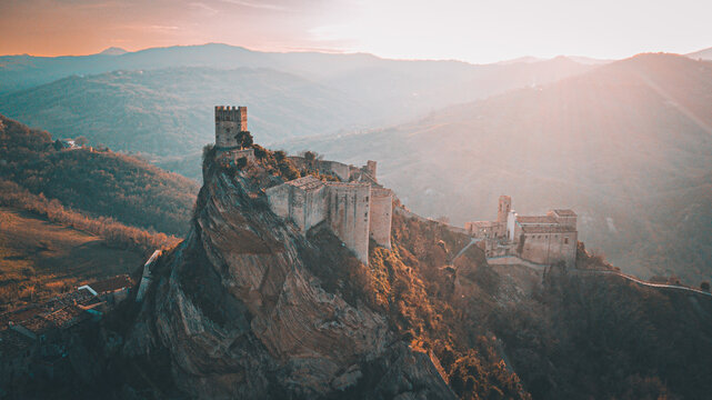Sunset over medieval village perched on hill top, Santo Stefano di Sessanio, Abruzzo, Italy. Romantic sky and clouds above mountains landscape, tourism destination.