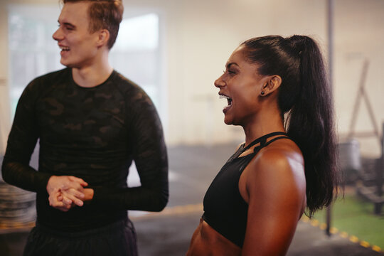 Fit young woman laughing with a friend at the gym