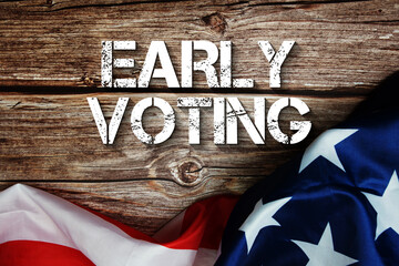 Early Voting text message with USA flag on wooden background