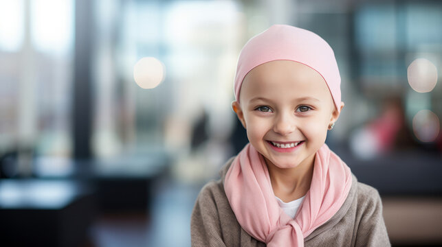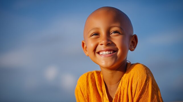 Portrait of happy bald child with cancer enjoying a sunny day outdoors