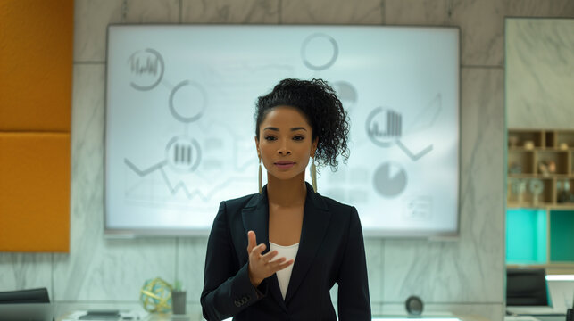 Femme souriante prenant la parole lors d'une conférence professionnelle devant une audience attentive, vie d'entrepreneur à un salon professionnel, dirigeant d'entreprise et coach inspirant