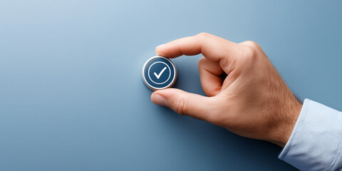 Blue shield with a green checkmark, chrome trim, and rivets, isolated