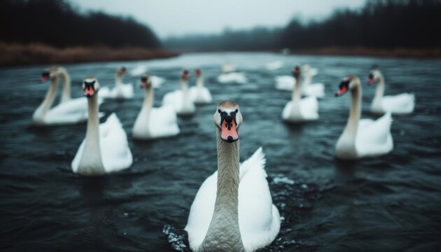 A flock of wild swans enhancing remote scenic landscapes, swan wild scenery, breathtaking allure, abstrack background, no blur, photo not dark, everything is clear, copy space