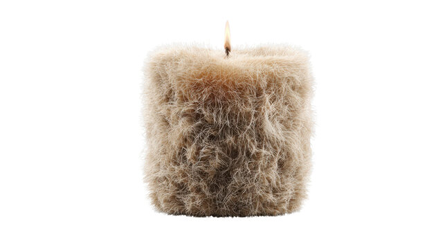 Furry cozy candle burning, creating a surreal and absurd paradox with fluffy texture and warm light