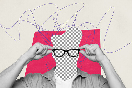 Creative collage picture illustration black white filter caricature headless take off eyewear unknown pink square beige doodle background