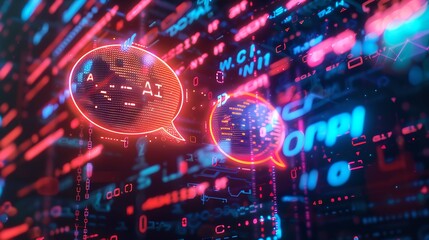 Neon chat bubbles on a dark digital background, symbolizing online communication.