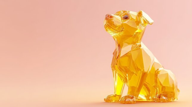 Geometric crystal dog sculpture with transparent amber glow on pink background