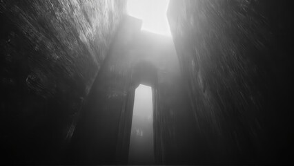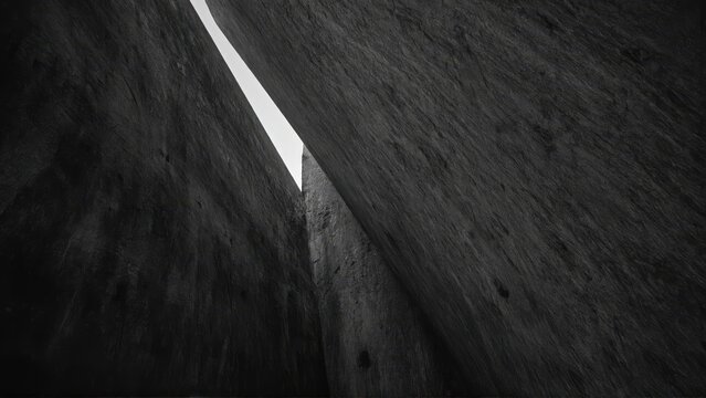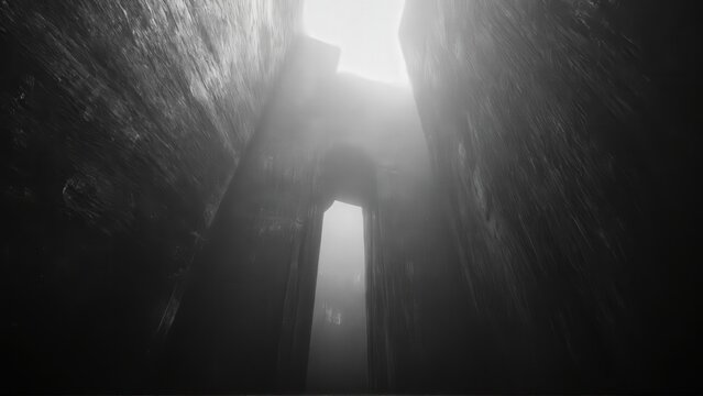generative ai, Dark, dramatic black-and-white architectural photograph of towering concrete walls with minimal light and sharp geometric contrasts