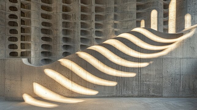 Concrete shadow play architectural lighting effects perforated concrete wall casting flowing wave shadows on raw concrete floor