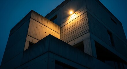 Modern concrete building at night illuminated by a single warm light casting dramatic shadows