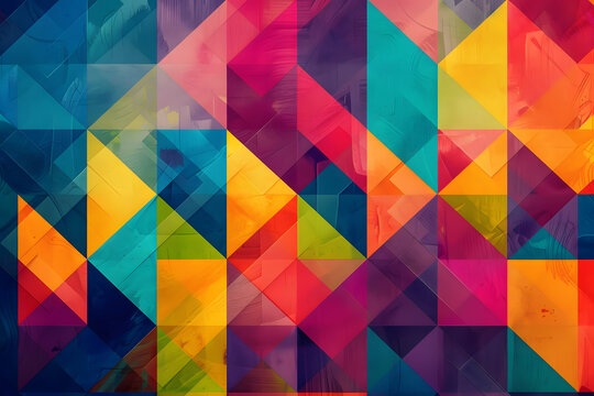 Fondo geométrico abstracto colorido con azul, lila, amarillo, rojo, naranja, rosa. Generado con IA.
