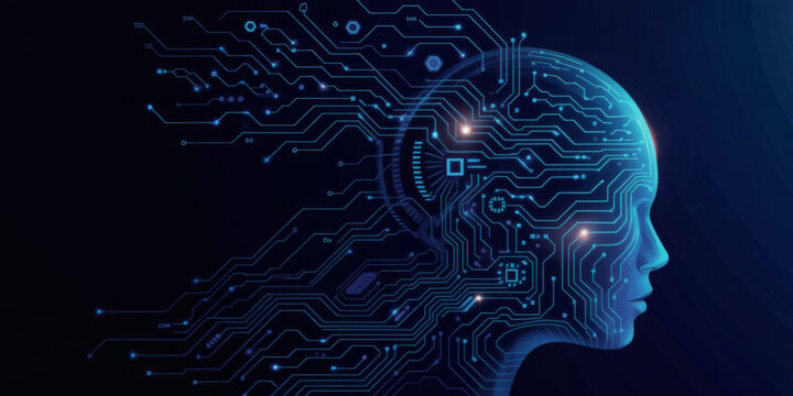 A futuristic illustration of a human head overlaid with circuit board patterns and an AI chip, highlighting the concept of artificial intelligence.