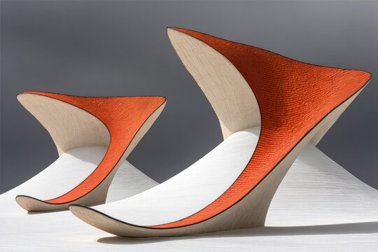 Two abstract, sculpted forms, resembling avian wings or architectural elements, feature a light beige/tan base and vibrant orange/red sculpted upper surfaces