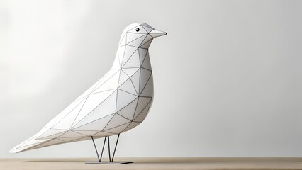 White Geometric Bird Sculpture with Black Dots and Thin Metal Legs on Wood Surface