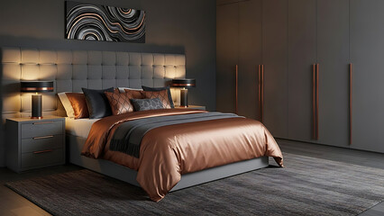 Modern luxury bedroom interior with copper bedding and minimalist decor
